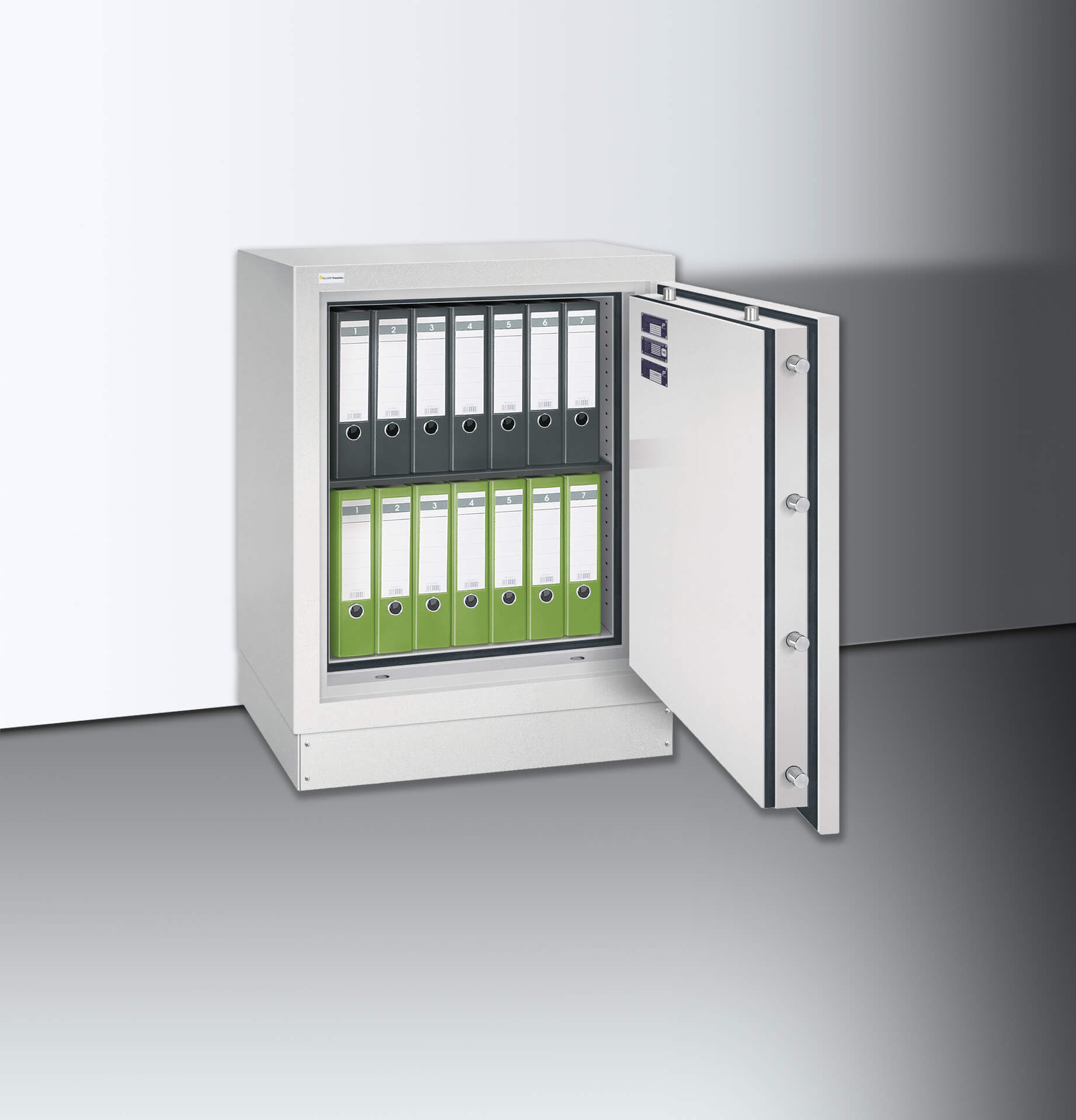 Die sicherste Baureihe für Papier ist mit erhöhtem Einbruchschutz Widerstandsgrad I zertifiziert. Die Spezialfüllung im Inneren des mehrwandigen Tresorkorpus und Tür mit Bohr- und Schneidbrennschutz bilden zusammen mit der formgegossenen Spezialpanzerung im Verschlussbereich einen undurchdringlichen Panzer für Ihre Akten. Vor Diebstahl kann eine vormontierte Bodenverankerung genutzt werden. Alle SDS-Modelle sichern Papier bis zu 120 Minuten gegen Brand. Das ist höchster Feuerwiderstand kombiniert mit starkem Einbruchschutz.