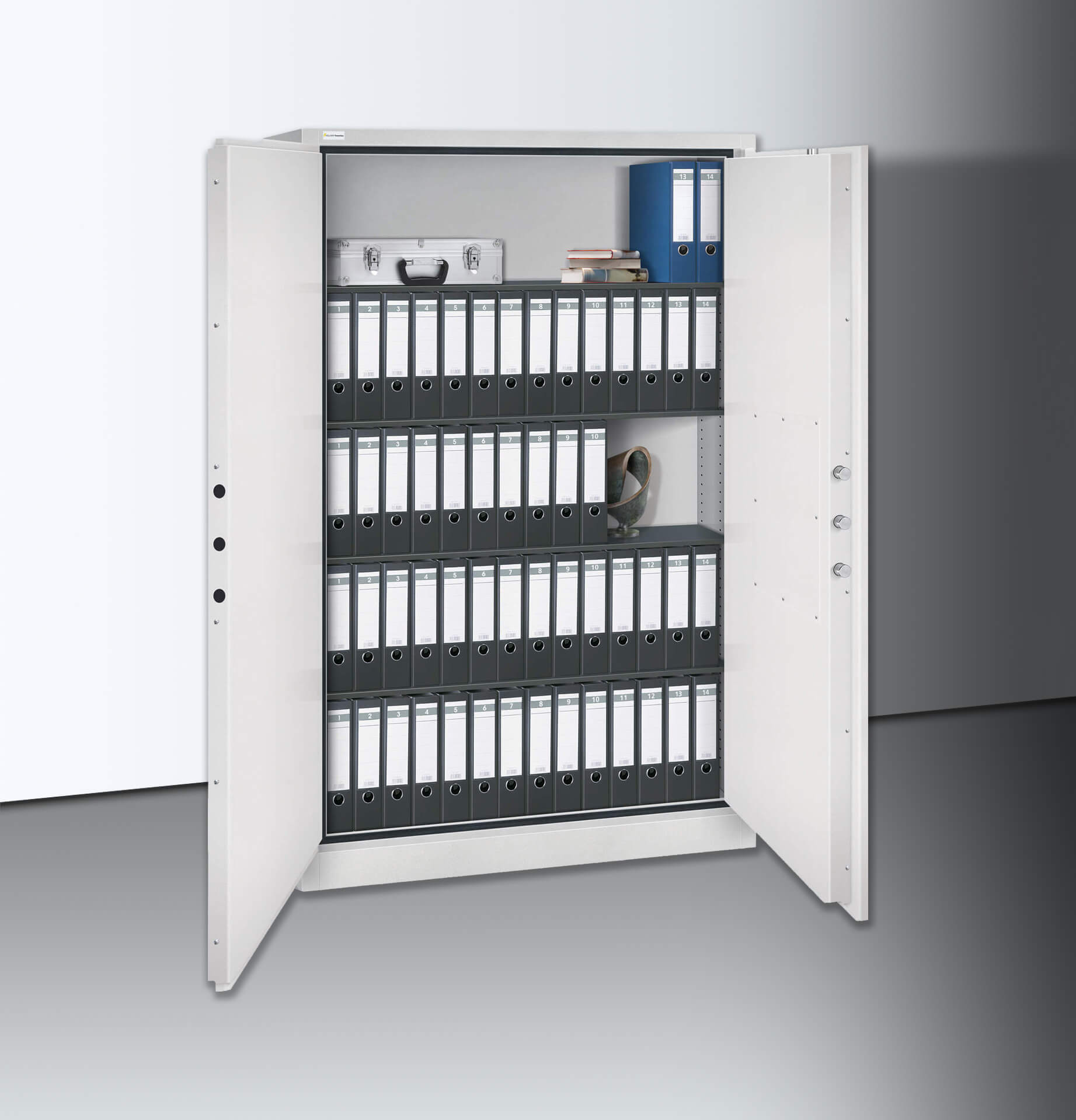 Die TSS-Modelle sind für große Aktenmengen die ideale Aufbewahrungsmöglichkeit. Sie schützen vor schnellen Einbruchversuchen durch Spezialbeton im doppelwandigen Stahlkorpus sowie den massiven Verriegelungs-Bolzen der dreiwandigen Stahltür. Selbst bei durchtrennten Scharnierbändern blockieren Stahl-Hintergreiferschienen das Aushebeln der Tür. Vor leichtem Brand sichert die Isolation des Tresorkörpers mit feuerbeständigem Qualitätswerkstoff sowie eine vierfach umlaufende Feuerfalz.