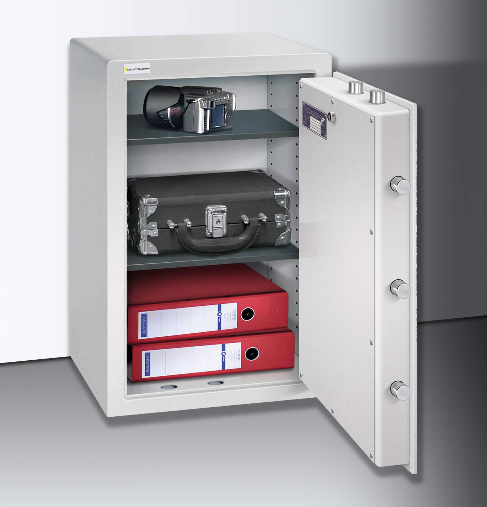 - Wahlweise mit Doppelbart-Sicherheitsschloss inklusive 2 Schlüssel oder einem nach EN 1300 zertifizierten mechanischen Zahlenkombinationsschloss ausgestattet